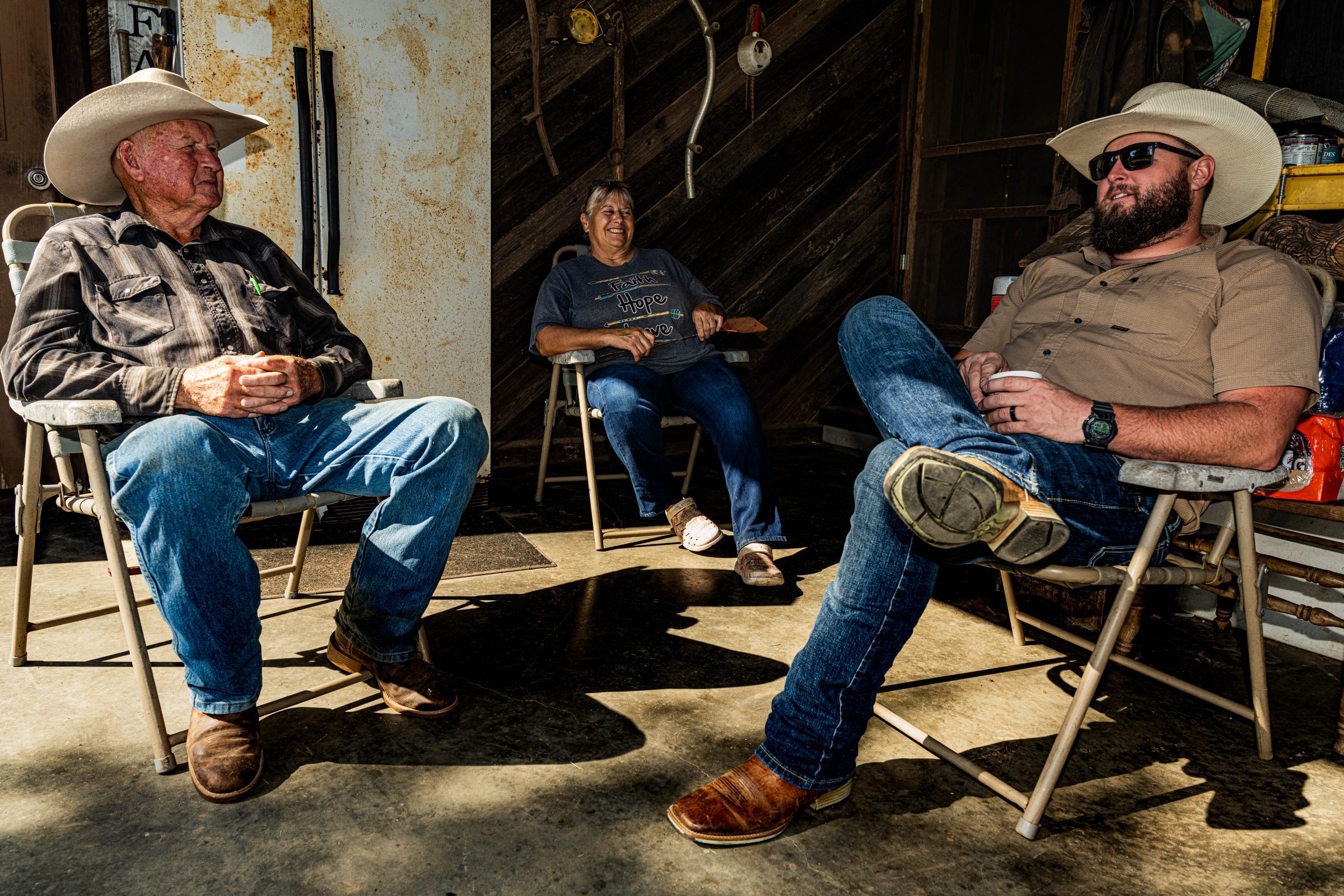A quintessential cowboy, even at 83, Don still puts on his uniform each day: a denim long sleeve Wrangler button-up shirt with dirt stains on the sleeves, jeans, boots, and a tan cowboy hat.
