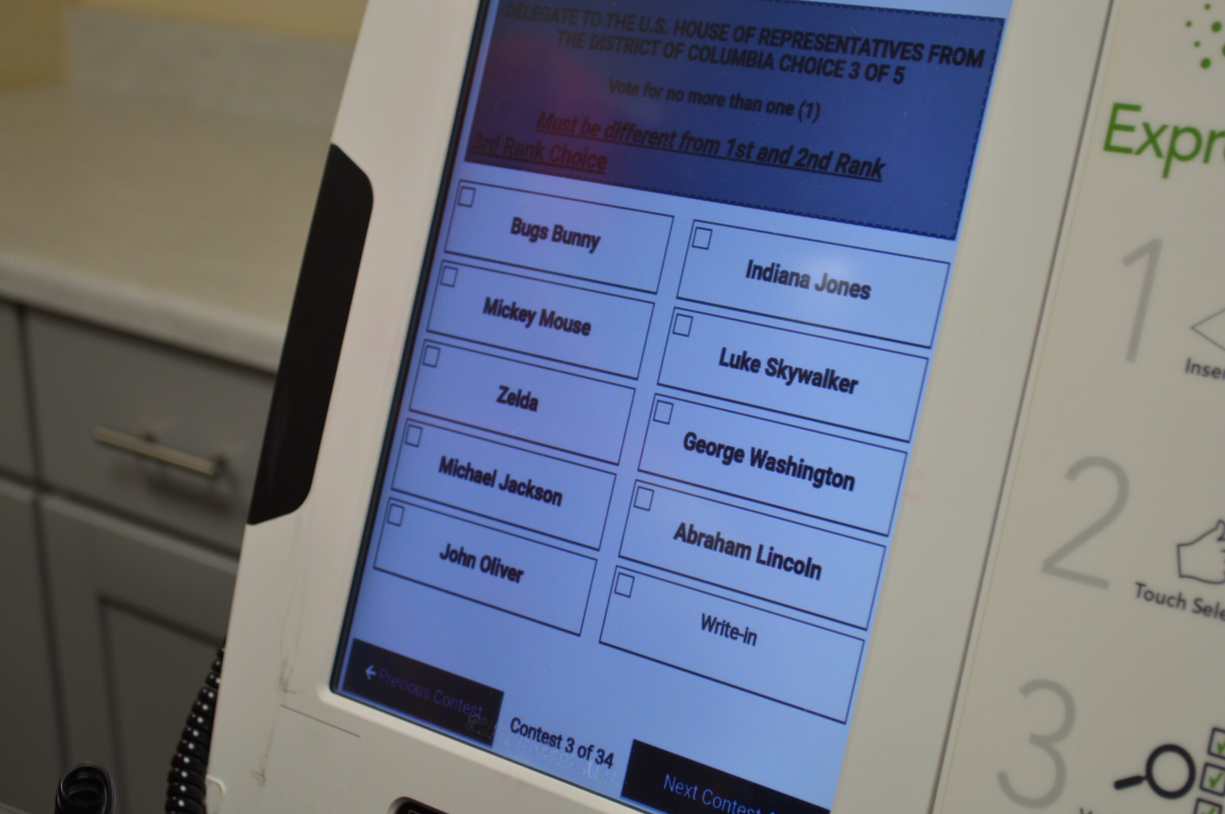 “It’s very different from how we’ve voted before,” she said in Spanish, pointing to the 17-inch ballot with Bugs Bunny, Mickey Mouse, Zelda, Michael Jackson, Luke Skywalker, and George Washington listed next to a grid, where voters could rank them. “Today we can practice so you can get a sense of how to vote.”