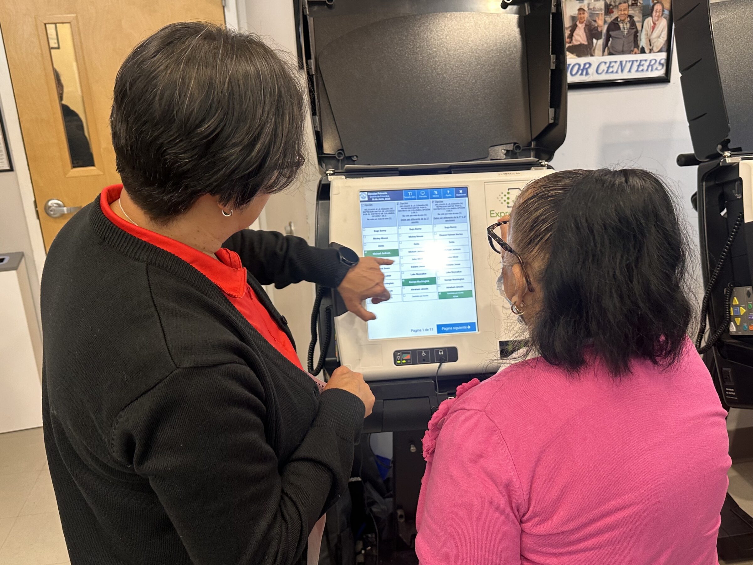 At a senior center in Foggy Bottom, Garcia and her colleague Yewoinhareg Kebede showed voters the same sample ballots used in Brightwood—Bugs Bunny led the candidate field for Congress, while Beyonce faced Donald Duck and others in the mayor’s race.